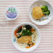 きつねうどん 豆腐つくねの照り焼き 付け合せ(ブロッコリー) ゼリー 小魚