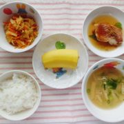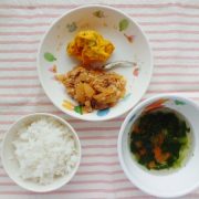 ごはん 豚肉のケチャップ焼き かぼちゃサラダ コンソメスープ 小魚