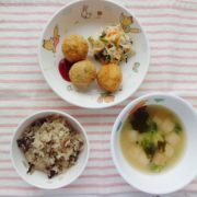 牛肉とごぼうの炊き込みご飯 里芋のコロコロチーズ揚げ 小松菜のツナ和え 味噌汁