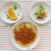 ミートスパゲティー ゆで野菜サラダ 果物(オレンジ) 小魚