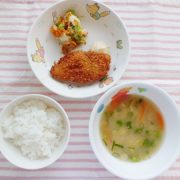 ごはん 白身魚フライ キャベツのごま和え 味噌汁