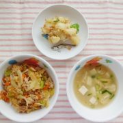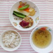 麦ごはん キャベツハンバーグ 野菜の味噌マヨディップ コンソメスープ 小魚