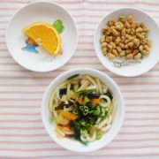 かやくうどん 大豆のあおのり揚げ 果物(オレンジ) 小魚