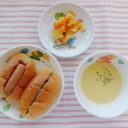 ホットドッグ ロールサンド ジャガイモソテー スキムコーンスープ 小魚