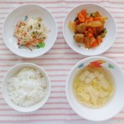 ごはん 肉団子の甘酢 春雨サラダ かき玉スープ 小魚