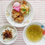 ☆お誕生日会☆ ふりかけごはん 鶏肉の唐揚げ ゆで野菜サラダ コンソメスープ チュルルン