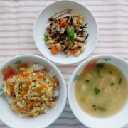 親子どんぶり 大豆のひじき煮 具だくさん味噌汁 小魚