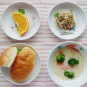 ロールパン クリームシチュー もやしとカニカマの洋風サラダ 果物(オレンジ) 小魚