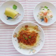 ミートスパゲティー ポテトサラダ 果物(バナナ) 小魚