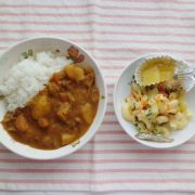 カレーライス マカロニサラダ 果物(パイン缶) 小魚