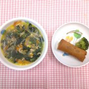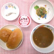 ロールパン マカロニグラタン 小松菜のツナ和え コンソメスープ 小魚
