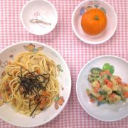 ツナの和風スパゲティ ゆで野菜サラダ 果物(みかん) 小魚
