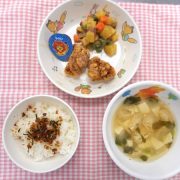 ☆誕生会☆ ふりかけごはん 鶏肉の唐揚げ さつまいもサラダ みそ汁 ゼリー