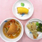 きつねうどん ちくわの磯辺揚げ 付(ブロッコリー) 果物(バナナ) 小魚