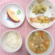 ごはん 鮭のチーズ焼き 粉ふき芋 豚汁 果物(リンゴ)