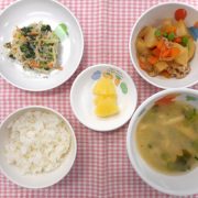 ごはん 豚肉じゃが 小松菜のツナ和え 味噌汁 果物(パイン缶)