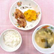 ごはん 鶏肉の甘酢焼き かぼちゃサラダ 味噌汁 小魚