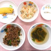 ビビンバ風丼 春雨サラダ ワカメスープ 果物(バナナ) 小魚