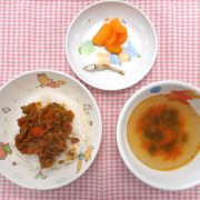 ☆自由保育☆ ドライカレー ワカメスープ 果物(みかん缶) 小魚