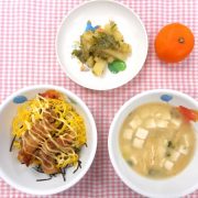 ☆自由保育☆ 親子どんぶり みそ汁 果物(もも缶) 小魚
