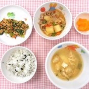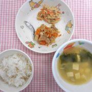 わかめご飯 豚肉じゃが 小松菜と納豆のネバネバ和え みそ汁 果物(ミカン缶) ※小松菜と納豆のネバネバ和え…献立表ではオクラでしたが、小松菜に変更····