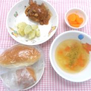 ロールパン 煮込みハンバーグ 粉ふき芋 コンソメスープ 果物(ミカン缶)