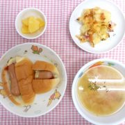 ホットドッグ ジャーマンポテト コンソメスープ 果物(パイン缶)