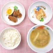 ごはん 鶏肉とゆで卵のさっぱり煮 白菜とツナのサラダ みそ汁 小魚