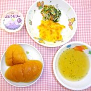 ロールパン マカロニグラタン 小松菜のツナ和え コンソメスープ ゼリー