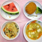 炊き込みご飯 コロッケ 具だくさんみそ汁 付(ブロッコリー) 小魚 果物(スイカ)