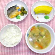ごはん さばの塩焼き カリカリきゅうり 豚汁 果物(バナナ)