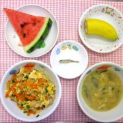 ☆自由保育☆ 親子どんぶり みそ汁 果物(バナナ) 小魚 果物(すいか)