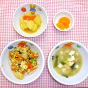 親子どんぶり じゃがいもの含め煮 味噌汁 果物(ミカン缶)