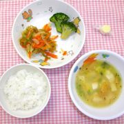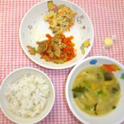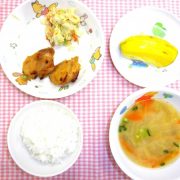 ごはん 鶏肉の甘酢焼き キャベツとツナのサラダ 具だくさんみそ汁 果物(バナナ)