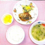 ごはん 鯖の竜田揚げ 和風マカロニサラダ みそ汁 果物(パイン缶)