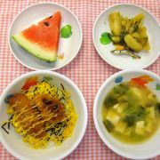 鶏マヨ丼 じゃがいもとピーマンの甘辛炒め みそ汁 小魚 果物(スイカ)