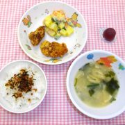 ☆誕生会☆ ふりかけごはん 鶏肉の唐揚げ マセドアンサラダ 味噌汁 ゼリー
