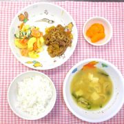 ごはん トンテキ マカロニサラダ 味噌汁 果物(ミカン缶) 小魚