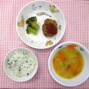 青菜ごはん カムカムハンバーグ ブロッコリーのごまあえ 味噌汁 小魚