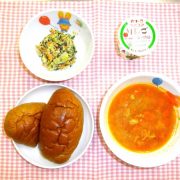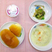 ロールパン さつまいもシチュー 春雨とレタスの和風ツナサラダ ヨーグルト 小魚