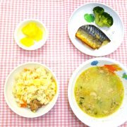 たけのこご飯 鯖の塩焼き 付(ブロッコリー) 豚汁 果物(パイン缶)