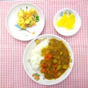 ポークカレー マカロニサラダ 果物(パイン缶) 小魚