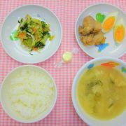 ごはん 鶏肉とゆで卵のさっぱり煮 小松菜とキャベツのジャコ和え 味噌汁 チーズ