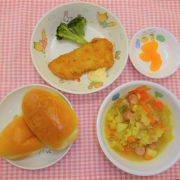 ロールパン 白身魚フライ 付(ブロッコリー) ポトフ 果物(ミカン缶)