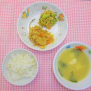 ごはん 鶏肉の甘酢焼き かぼちゃサラダ みそ汁 チーズ