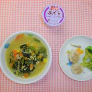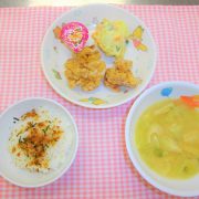 ☆誕生会☆ ふりかけごはん 鶏肉の唐揚げ マセドアンサラダ みそ汁 ゼリー