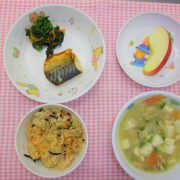 炊き込みご飯 鯖の塩焼き ほうれん草のゴマ和え 豚汁 果物(リンゴ)