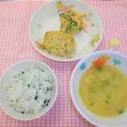 わかめご飯 豆腐ハンバーグ ブロッコリーとツナのサラダ みそ汁 チーズ