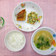 炊き込みご飯 鮭のチーズ焼き 付(ブロッコリー) みそ汁 柿(保護者からいただきました)