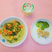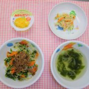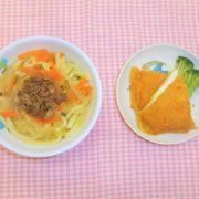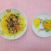 きのこスパゲティー かぼちゃサラダ 果物(パイン缶) 小魚